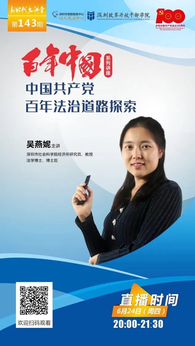 第143期作客《新时代大讲堂》的嘉宾是深圳市社会科学院经济所研究员、教授,法学博士、博士后,德国马克思普朗克公法研究所访问学者吴燕妮。吴教授将与大家分享“中国共产党百年法治道路探索”。