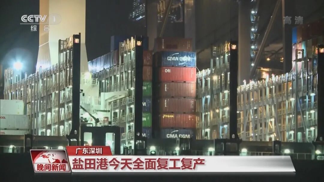 6月24日晚,央视《晚间新闻》节目报道了深圳盐田港自24日零时起全面复工复产,港口泊位基本恢复正常运作。