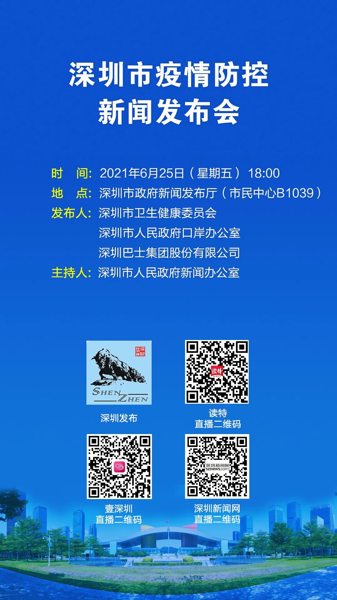 2021年6月25日(星期五)18:00,我市将举行疫情防控新闻发布会,邀请市卫生健康委、市口岸办、深圳巴士集团有关负责人出席发布会,通报我市疫情防控最新情况,并回答记者提问,敬请关注。
