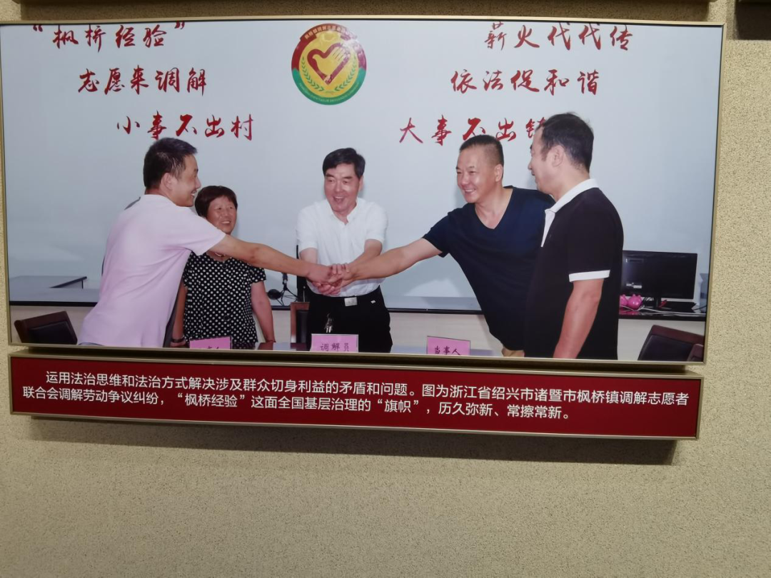 运用法治思维和法治方式解决涉及群众切身利益的矛盾和问题。图为浙江省绍兴市诸暨市枫桥镇调解志愿者联合会调解劳动争议纠纷,“枫桥经验”这面全国基层治理的“旗帜”,历久弥新。