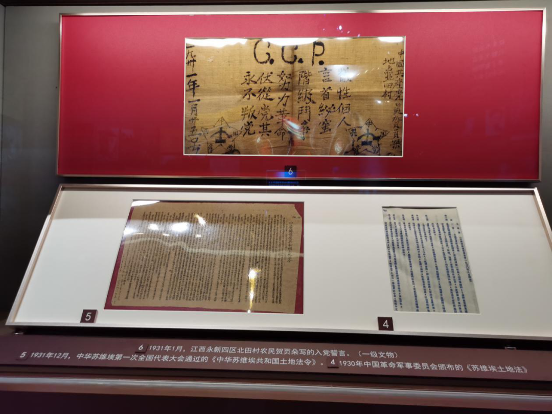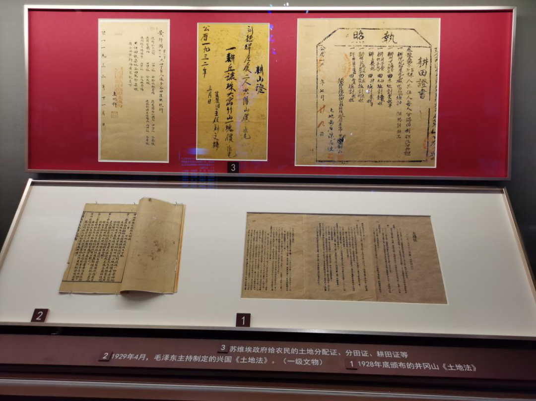 图为1928年底颁布的《井冈山土地法》;1929年4月,毛泽东主持制定的兴国《土地法》;苏维埃政府给农民的土地分配证、分田证、耕田证等。