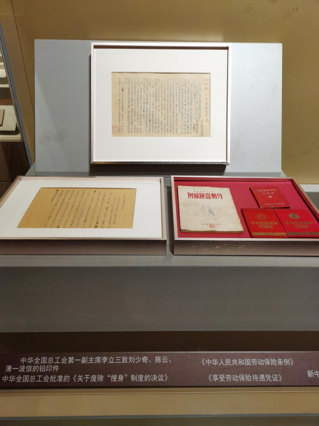 图为中华全国总工会批准的《关于废除“搜身”制度的决议》;《中华人民共和国劳动保险条例》等。《中华人民共和国劳动保险条例》使工人群众担心的生、老、病、死、伤、残等困难得到了初步解决。