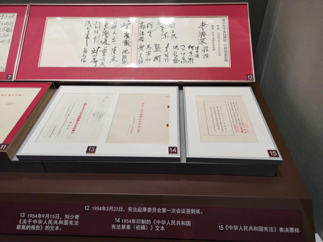 图为1954年3月23日,宪法起草委员会第一次会议签到纸;《中华人民共和国宪法》表决票样;1954年印制的《中华人民共和国宪法草案(初稿)》文本。