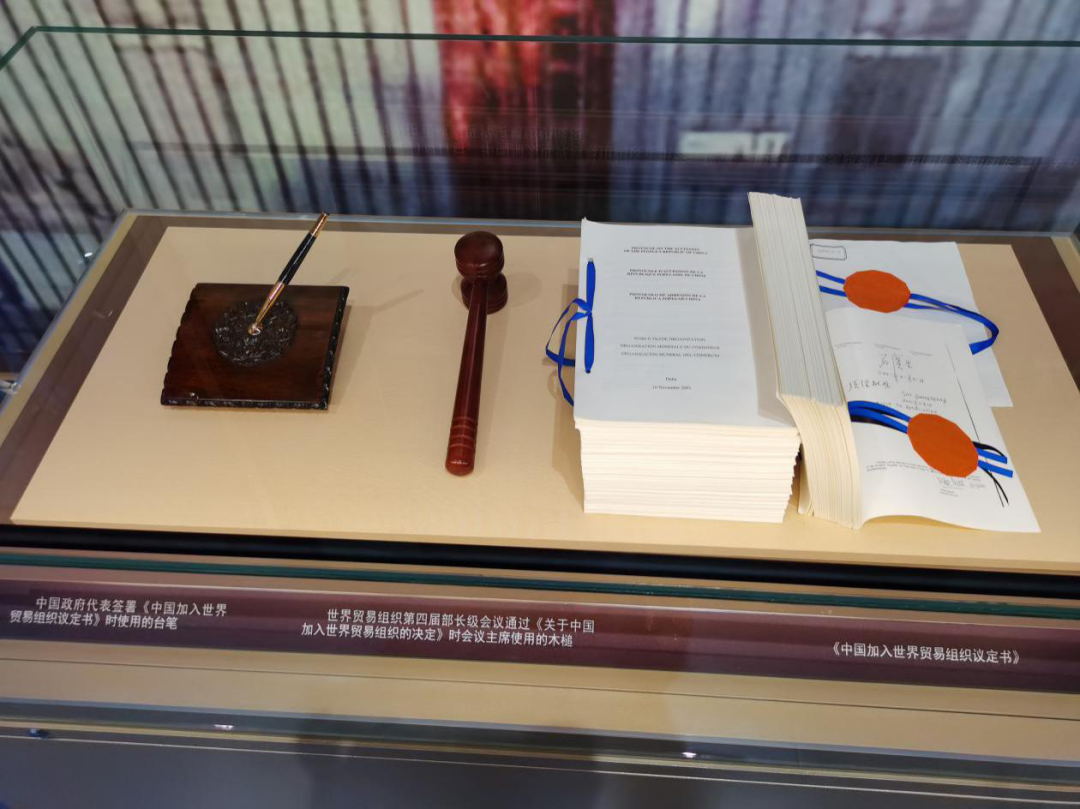 世界贸易组织第四届部长级会议通过《关于中国加入世界贸易组织的决定》时会议主席使用的木槌,以及《中国加入世界贸易组织议定书》等。