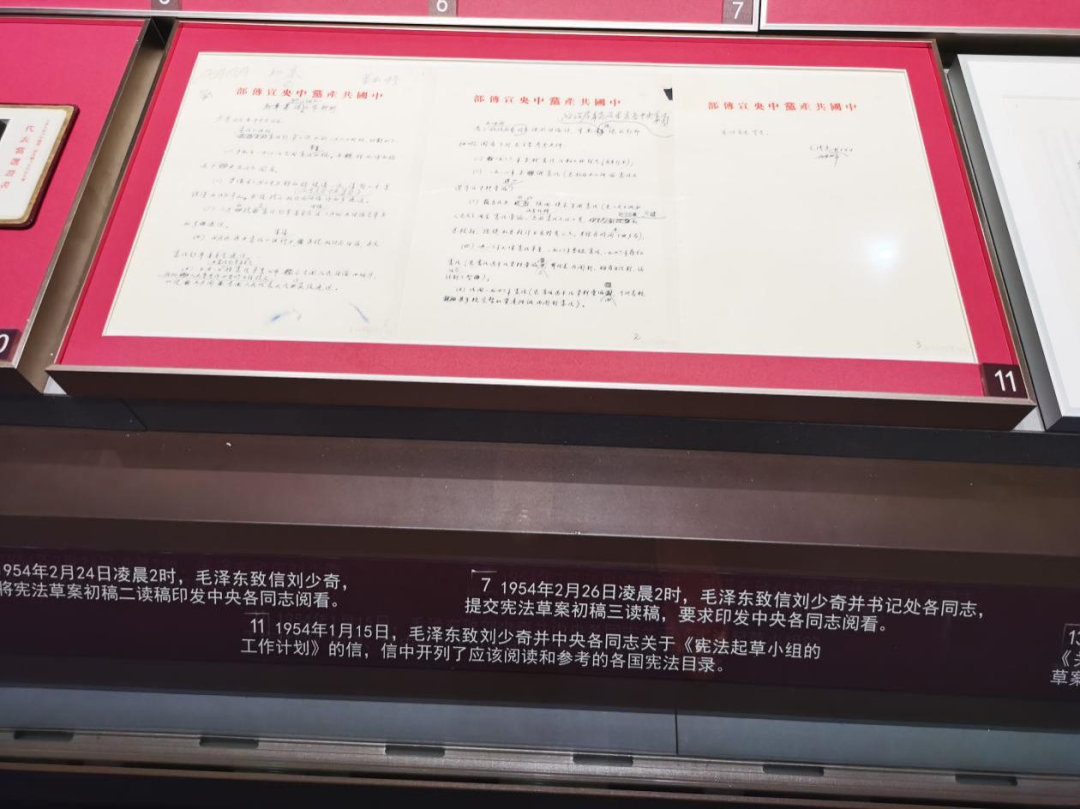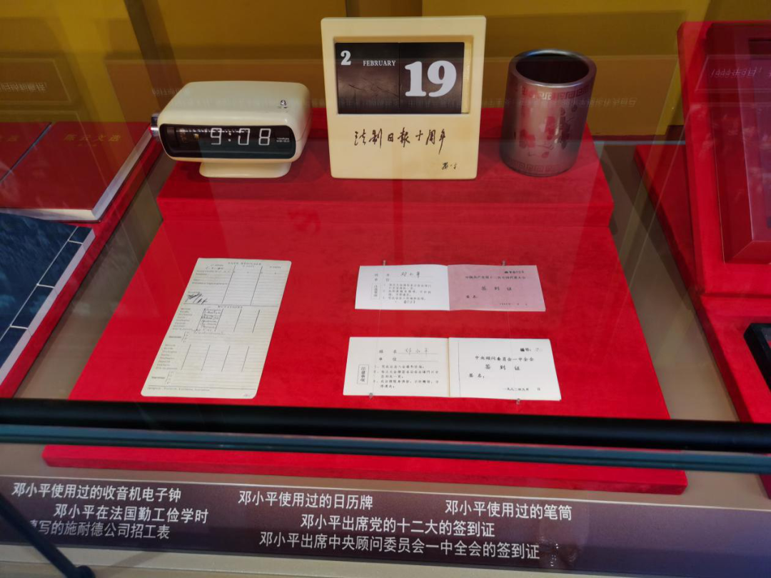 在中国共产党历史展览馆里,展品中有邓小平同志使用过的日历牌、笔筒、收音机电子钟等珍贵物件,日历牌上清晰留有邓小平同志亲笔字迹“法制日报十周年”。