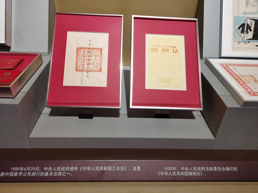 图为1950年6月29日,中央人民政府颁布《中华人民共和国工会法》,这是新中国最早公布施行的基本法律之一;1952年,中央人民政府法制委员会编印的《中华人民共和国婚姻法》。