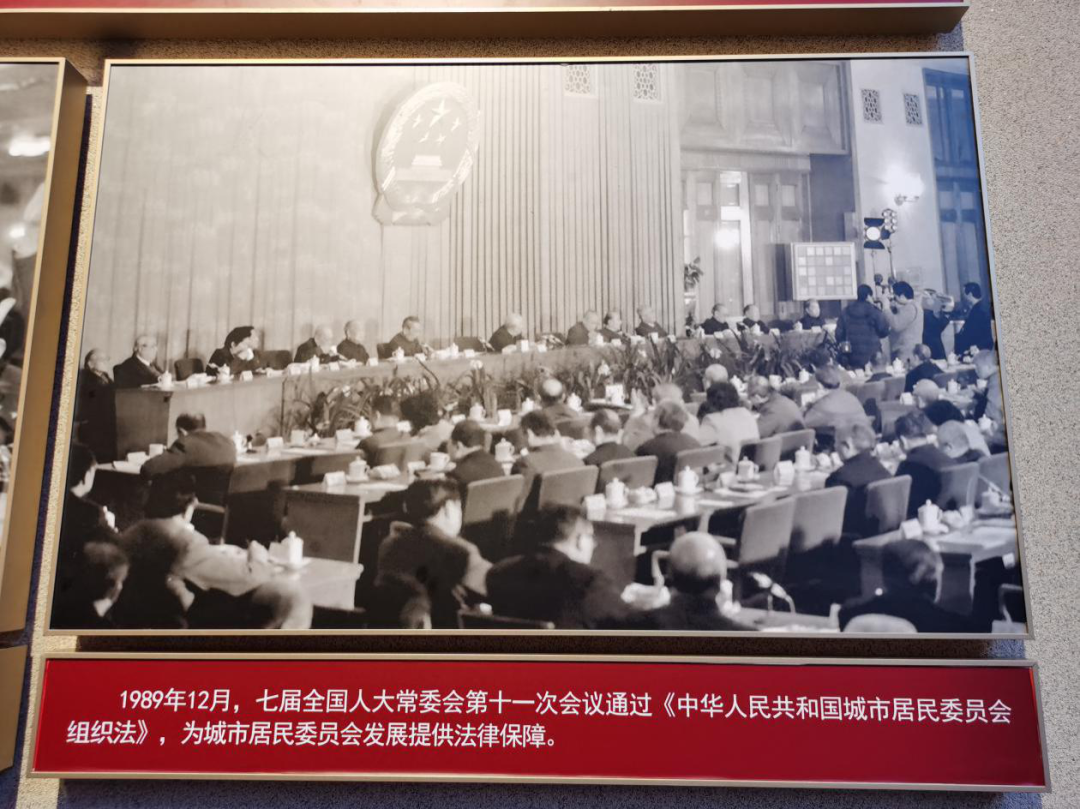 图为1989年12月,七届全国人大常委会第十一次会议通过《中华人民共和国城市居民委员会组织法》,为城市居民委员会发展提供法律保障。