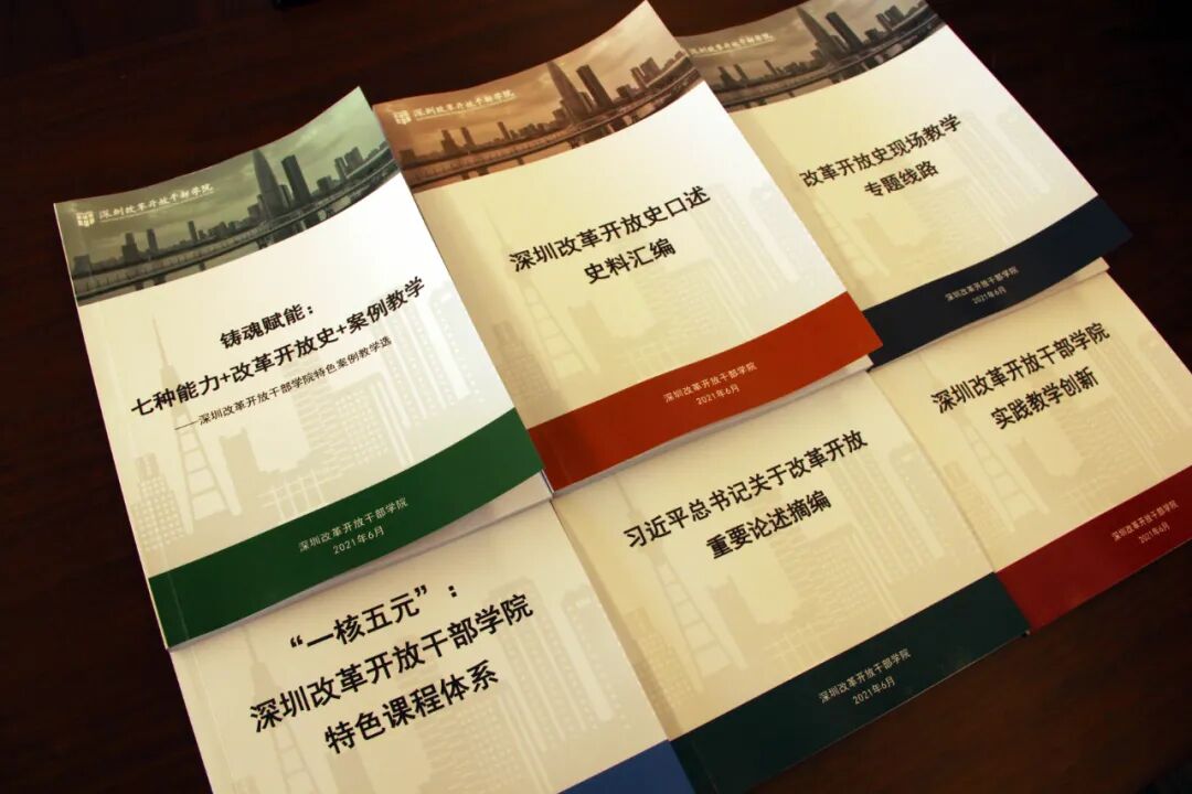 学院在教学研究中,聚焦改革开放,全面系统深入学习、研究、阐释习近平总书记关于改革开放的重要论述与讲话精神,总结和运用深圳作为经济特区取得的成就和经验,深入研究改革开放史与特区精神,形成了富有深圳特色的教学研究成果及教材,组织编写了《习近平总书记关于改革开放重要论述摘编》《“一核五元”:深圳改革开放干部学院特色课程体系》《改革开放史口述资料摘编》《深圳改革开放史现场教学专题线路》《铸魂赋能:七种能力案例教学选》《深圳改革开放干部学院实践教学体系创新》等教学研究成果。通过“带着问题来、伴着思考学、收获成果归、指导实践做”四个阶段和“定义问题、分析问题、解决问题”三个步骤,将“一核五元”课程与解决实际问题紧密结合,这些以深圳经验为特色的课程体系、教材体系、案例体系,突出实战实训、案例教学,呈现中国特色社会主义先行示范区建设路径和模式,体现目标导向、问题导向、实践导向、成果导向,在教学中取得了较好的效果。