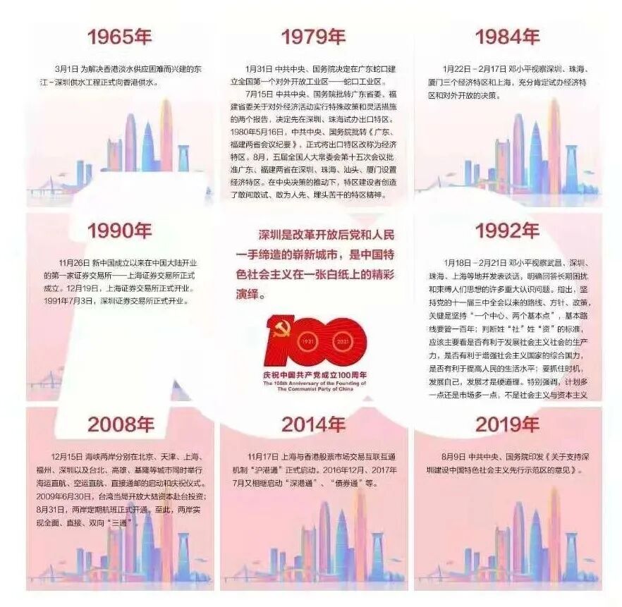 其中,东江—深圳供水工程、建立蛇口工业区、建立深圳经济特区、设立深圳证券交易所、邓小平视察深圳、中共中央国务院印发《关于支持深圳建设中国特色社会主义先行示范区的意见》等诸多深圳印记收录进《大事记》。