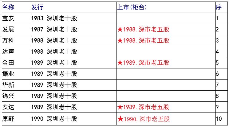 遥想1987年,深圳共有5家公司实现股份制改造并上市,这便是深圳人所熟悉的“老五股”:深发展(现“平安银行”)、深万科(现“深万科A”)、深金田(现已退市)、深宝安(现“深宝安A”)和深原野(现“世纪星源”)。