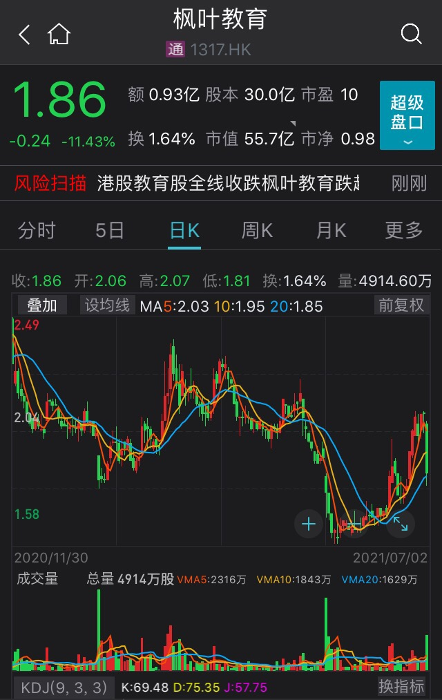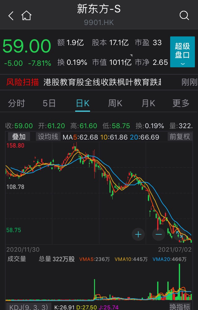 伴随对校外培训机构严厉监管,资本市场也在调整中。7月2日,新东方-S盘中大跌8.2%,报58.75港元,创历史新低。截至收盘,新东方-S跌超7%,枫叶教育跌超11%,中国东方教育跌超6%,思考乐教育跌超5%,新东方在线跌超4%。