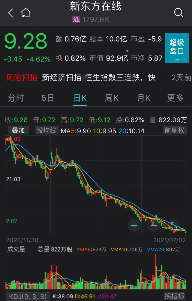 今年以来,新东方-S累计下跌54%,市值从2369亿港元跌至1011亿港元,蒸发了1358亿港元;新东方在线股价累计跌幅达65%,市值从279亿港元跌至93亿港元,相当于市值蒸发了186亿港元。