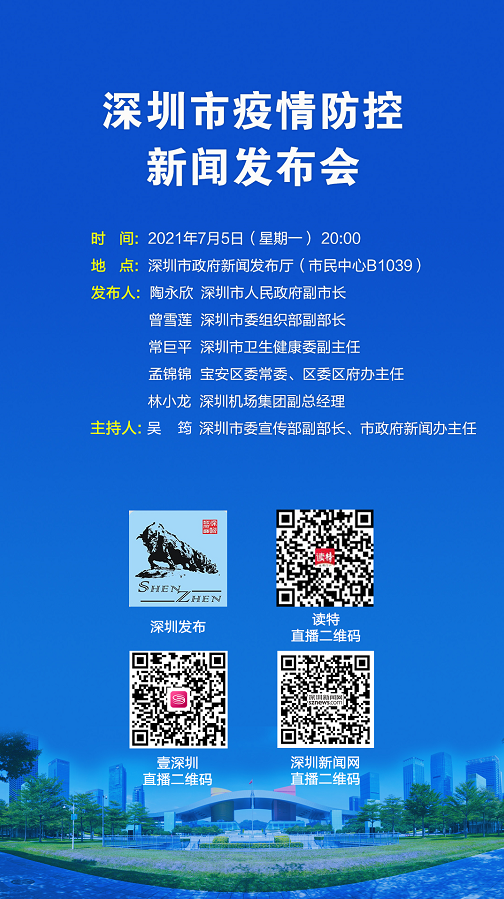 2021年7月5日(星期一)20:00,深圳市将举行疫情防控新闻发布会,邀请深圳市人民政府副市长陶永欣,以及深圳市委组织部副部长曾雪莲、深圳市卫生健康委副主任常巨平、宝安区委常委、区委区府办主任孟锦锦、深圳机场集团副总经理林小龙出席发布会,通报深圳市疫情防控的最新情况,并回答记者提问,敬请关注。