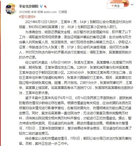 7月5日,北京市公安局朝阳分局发布通报,综合事实认定和伤情鉴定情况,朝阳公安分局已依法对张某刑事拘留。目前,案件正在进一步工作中。