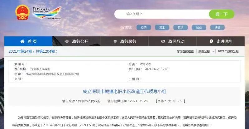 (原标题《近期,深圳市政府公报发布消息,深圳新成立两个领导小组——深圳市智慧城市和数字政府建设领导小组、深圳市城镇老旧小区改造工作领导小组。》)