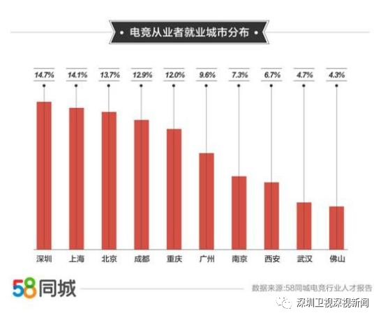 日前,58同城发布了《2021年电竞行业人才从业现状及发展研究报告》。报告显示,从城市维度来看,目前从业者以深圳、上海、北京、成都和重庆五座城市最为集中。其中,深圳以14.7%位居榜首。