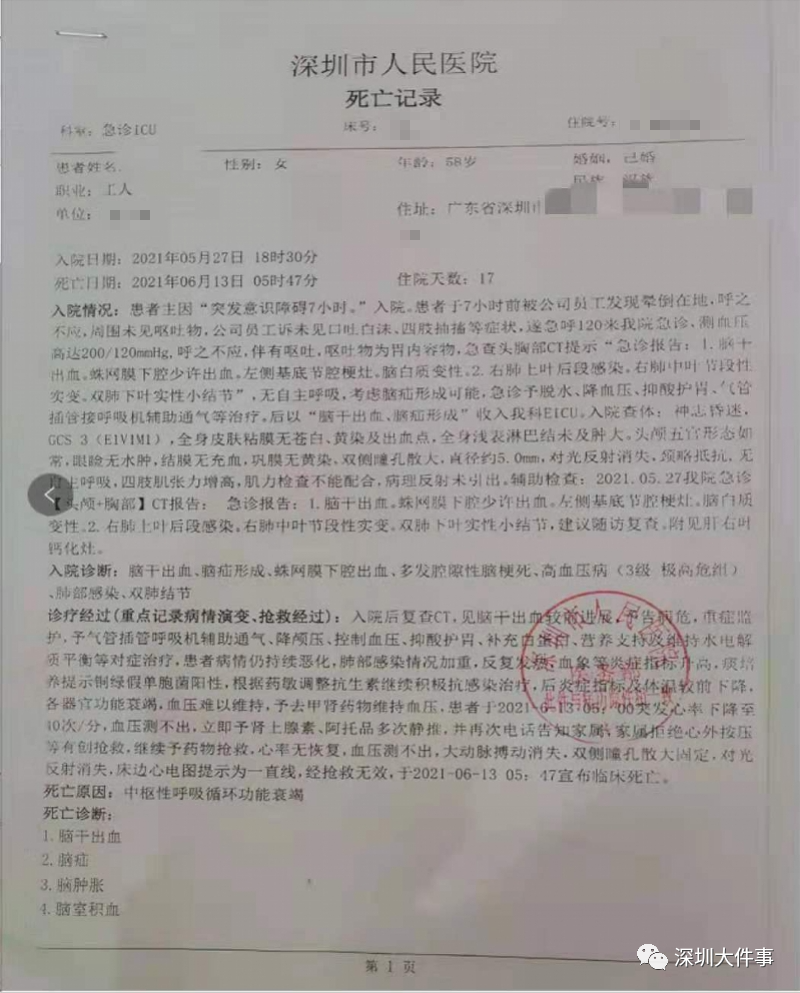 余先生称,从5月27日至6月13日,老人一直在深圳市人民医院急诊科ICU内接受抢救,期间一直处于脑死亡昏迷状态,只能通过呼吸机等医疗设备维持基本生命体征,最终于6月13日早上因多脏器功能衰竭,宣布医治无效死亡。