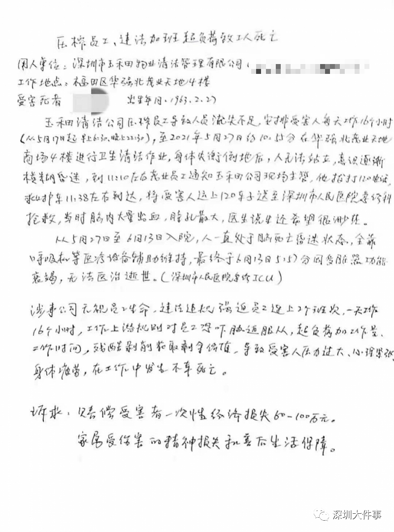 上月,该女保洁员家属已向深圳市福田区人民法院提起民事诉讼。家属称,为了便于诉讼期间开展相关工作,目前仍未将遗体火化。