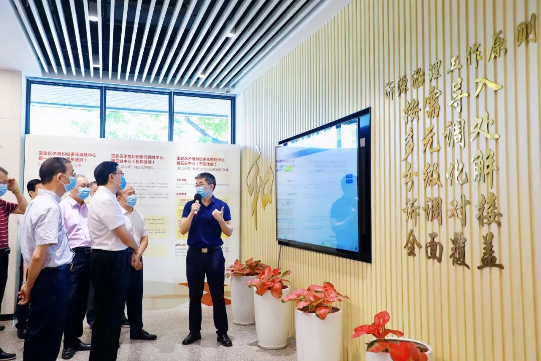 在宝安区矛盾纠纷多元调处中心,调研组详细了解宝安区开展人民调解、司法调解、行政调解衔接联动机制(简称“三调联动”)试点调处矛盾纠纷的工作情况,参观服务大厅、速裁法庭、调解室等场所,观看人民调解智慧平台“i调解”运作和功能展示。陈旭东与调解员交谈,了解“三调联动”试点工作开展取得的成效,倾听调解员对调解工作的意见建议,鼓励他们当好“老娘舅”,全心全意为群众排忧解难。他强调,要积极发挥“三调联动”在营造国际一流法治化营商环境中的重要作用,做好调解的“后半篇文章”,完善矛盾纠纷化解后的综合分析评估机制,加强诉源治理,推动矛盾纠纷化解在源头,推动更多法治力量向引导和疏导端用力,完善预防性制度规范,将各类社会矛盾纠纷化解在基层、化解在源头、化解在萌芽状态。要注重历史数据挖掘应用,充分发挥信息智能化在助力依法治理等方面的积极作用,推动数字法治、智慧司法建设,把城市精细化管理的“细枝末节”通过“智慧大脑”纳入法治视野之内,做到信息掌握全面、矛盾化解及时、依法防控得力、便民服务到位,助力加快推动城市治理体系和治理能力现代化。