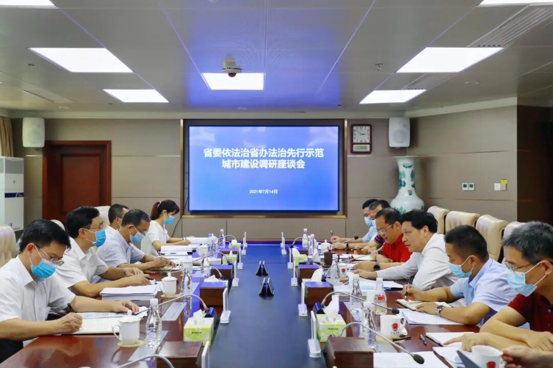 在深圳市司法局,调研组召开座谈会,听取深圳市委依法治市办、市人大常委会法工委、市中级法院、市检察院、市司法局、市场监管局、政务服务数据管理局等部门支持深圳建设中国特色社会主义法治先行示范城市的工作思路汇报。会议强调,要提高政治站位,深入学习贯彻习近平总书记“七一”重要讲话精神、习近平总书记出席深圳经济特区建立40周年庆祝大会和视察广东重要讲话、重要指示精神,深入学习贯彻习近平法治思想,并与当前正在开展的党史学习教育结合起来,整体贯彻落实,进一步提高思想自觉、政治自觉、行动自觉,坚定不移走中国特色社会主义法治道路,把习近平法治思想贯彻落实到全面依法治省、全面依法治市全过程和各方面,将其转化为深入推进法治广东、法治深圳建设的生动实践和精彩演绎。要进一步增强信心决心、激发志气士气,奋力抓住机遇、奋勇迎接挑战,坚持先行先试、引领示范,全面推进科学立法、严格执法、公正司法、全民守法,全面建设法治城市、法治政府、法治社会,努力将深圳打造成中国特色社会主义法治的“窗口”和“名片”。