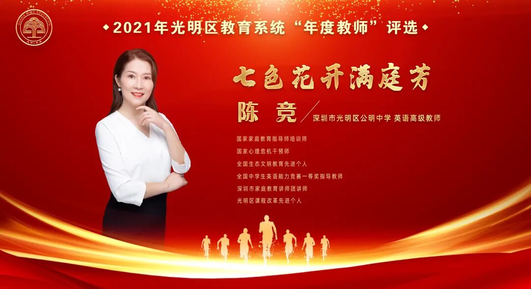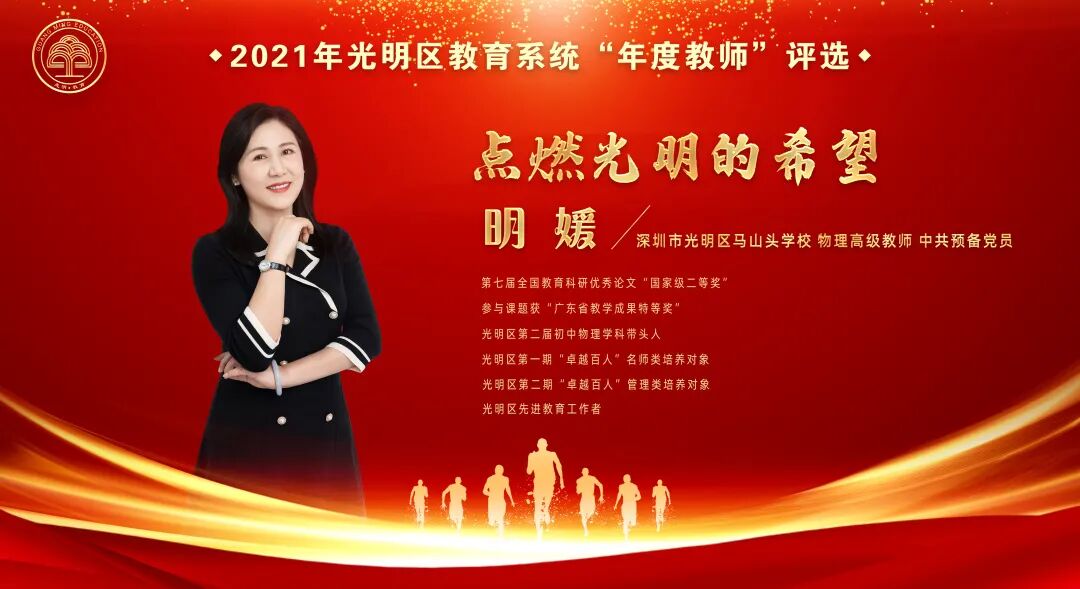 经过激烈角逐,光明区高级中学余晶晶、凤凰城实验学校程志、公明中学陈竞老师荣获光明区“年度教师”称号。其中,来自光明区高级中学的余晶晶老师将带着大家的祝福和期盼,登上市级舞台,代表光明教育人继续逐梦。