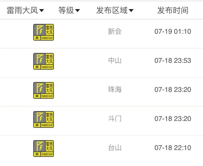 新会、中山、珠海、斗门、台山发布雷雨大风黄色预警。