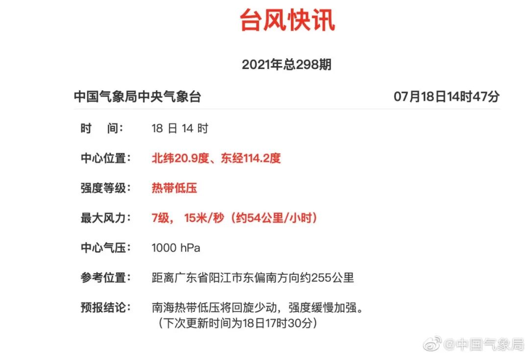 另一个南海的台风则以较为确定的路径将登陆广东,7月18日14时,南海热带扰动加强为热带低压,17时其中心位于距离江门台山东偏南方向约190公里的海面上,预计其将回旋少动,缓慢靠近珠江口到粤西沿海,有可能加强为今年第7号台风(热带风暴级),并可能于20日白天在上述沿海地区登陆。