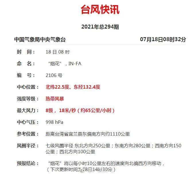 7月18日2时,今年第6号台风“烟花”(热带风暴级)在菲律宾以东洋面上生成,18日17时,台风中心位于距离台湾省宜兰县东偏南方向约1110公里的洋面上,预计其将以10公里左右的时速向西北方向移动,强度逐渐加强,最强可达台风或强台风级(13至15级,40米/秒至48米/秒)。