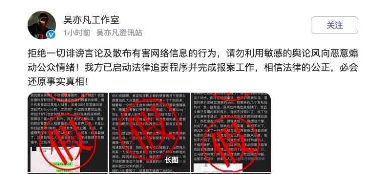 今日早间,吴亦凡工作室发文,表示“拒绝一切诽谤言论及散布有害网络信息的行为,请勿利用敏感的舆论风向恶意煽动公众情绪!”吴亦凡工作室还称已启动法律追责程序并完成报案工作,“相信法律的公正,必会还原事实真相!”