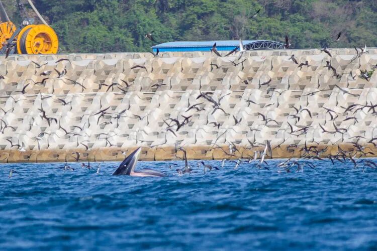 7月初,布氏鲸“小布”捕食时吸引了大量燕鸥(李博 拍摄)