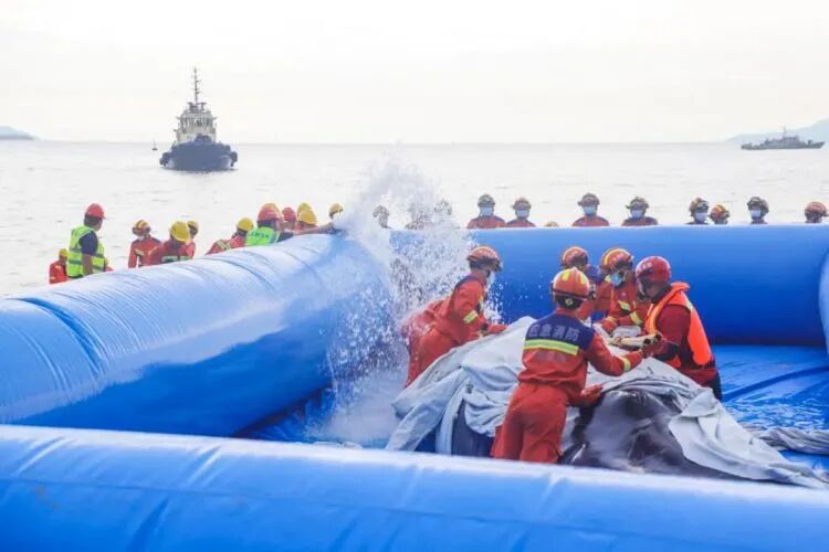 7月16日,新区在玫瑰海岸沙滩,进行了多部门联动的鲸豚救护应急预案演练,采取海陆结合的方式进行,海上主要依托于海洋综合执法,海警、海事等力量做好外围巡逻以及海上的救助;如果鲸豚类动物发生搁浅,陆上将主要依托公安外围保障,以消防队员、志愿者等力量为主,在尽可能短时间内合力救助。