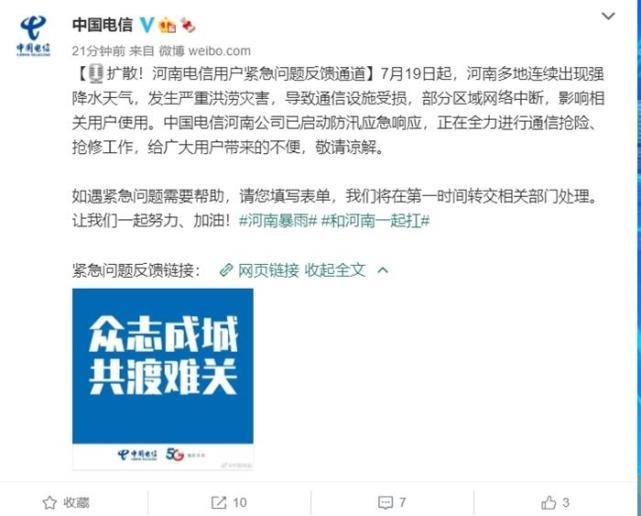 “7月19日起,河南多地连续出现强降水天气,导致通信设施受损,部分区域网络中断,影响相关用户使用。”中国电信最新发布消息称。