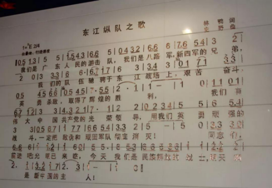“我们是广东人民的游击队,我们是八路军、新四军的兄弟,我们的队伍驰骋于东江战场上,艰苦奋斗、英勇杀敌,取得了辉煌的胜利。我们有伟大中国共产党的光荣领导,用我们英勇顽强的战斗,一定把敌伪和顽固军队彻底消灭,同志们,前进吧!光明已来临,今天,我们是民族解放的战士,明天啊,是新中国的主人!”这首歌叫《东江纵队之歌》,是东江纵队的队歌,一首斗志昂扬的红色赞歌。这首歌表现了东纵战士们浴血奋战、英勇抗敌的革命精神,唱出了东江纵队英勇杀敌、赴汤蹈火的英雄气概。