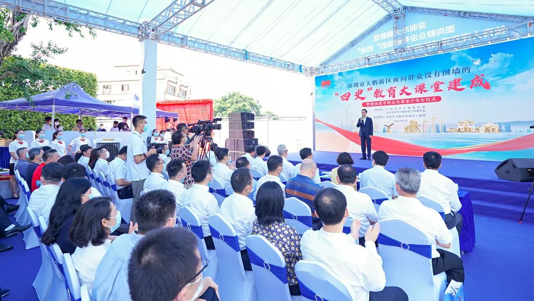 7月23日,深圳市大鹏新区“面向群众没有围墙的‘四史’教育大课堂”建成暨现场教学精品党课集中发布仪式在大鹏新区党工委党校举行。活动由中共深圳市委组织部、大鹏新区党工委主办,大鹏新区组织人事局承办。深圳市委常委、组织部部长程步一,原国家行政学院副院长周文彰,中央党校教授、博士生导师姜平,全国党建研究会秘书处处长刘源,中国浦东干部学院教学研究部副主任、国际培训教学分部主任柏学翥,广东省委党校副校长、广东行政学院副院长、一级巡视员余甫功,广东南岭干部学院副院长杨斌等出席活动。