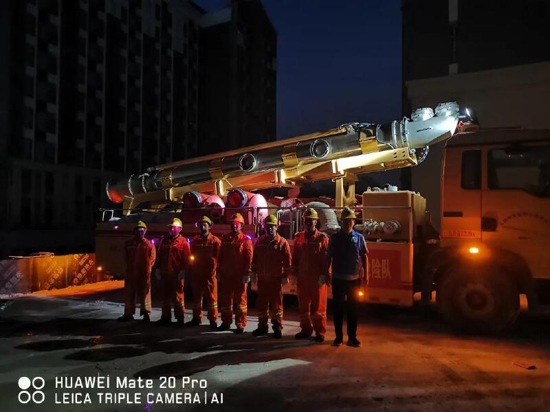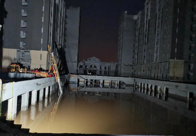 当晚20:00,排涝抢险车到达小区,全体队员立即按预案实施报管施工,现场布置水管260米;22:00,做好各项准备工作;22:30,现场开始抽水。“我们这次携带的是垂直供排水抢险车,每小时排水量可以达3000立方米,比较适合基坑、隧道的排涝抽水任务。”刘建昌介绍,现场首淹面积达2万平方米,因为现在还在施工,现场遇到了不少难题,排水量也受到一定的限制,比原计划需要的时间要更久一些。刘建昌还四处勘察,想办法找其他的出水通道。