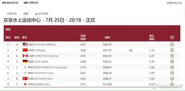 其中,李冰洁游出4分01秒57,创造新的亚洲纪录,排名第二,仅次于美国名将莱德基。汤慕涵游出4分04秒07,位列小组第四,最终以预赛第8晋级决赛,同时刷新了个人最好成绩。此前汤慕涵的最好成绩是在2021年全国冠军赛暨东京奥运会选拔赛,游出的4分05秒15。