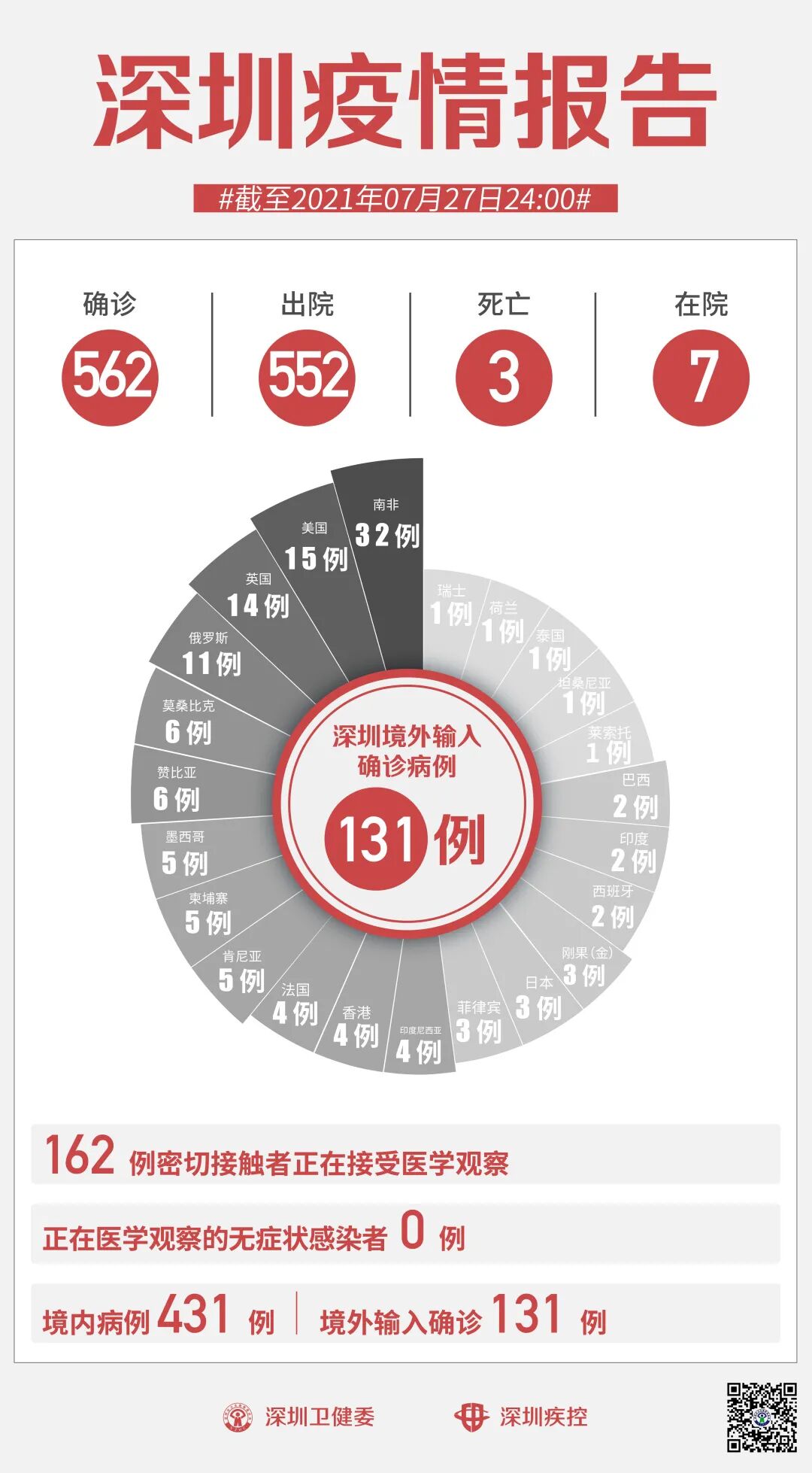 截至7月27日24时,深圳市累计报告新冠肺炎确诊病例562例。