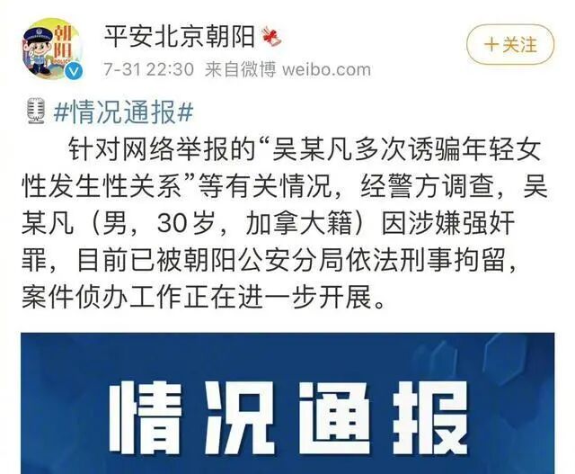 日前,北京市公安局朝阳分局通报:针对网络举报的“吴某凡多次诱骗年轻女性发生性关系”等有关情况,经警方调查,吴某凡(男,30岁,加拿大籍)因涉嫌强奸罪,目前已被朝阳公安分局依法刑事拘留,案件侦办工作正在进一步开展。媒体确认,通报中的“吴某凡”就是红极一时的流量明星吴亦凡。