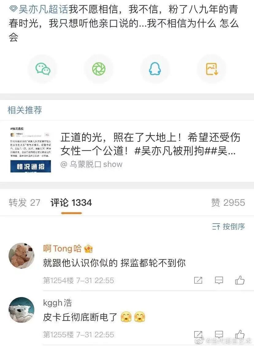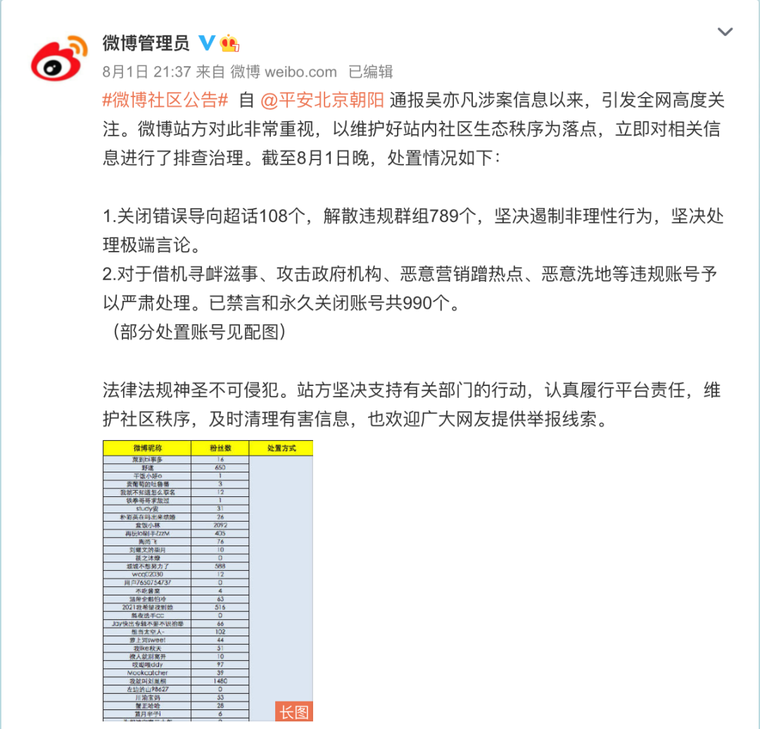 据@微博管理员 自 @平安北京朝阳 通报吴亦凡涉案信息以来,引发全网高度关注。微博站方对此非常重视,以维护好站内社区生态秩序为落点,立即对相关信息进行了排查治理。截至8月1日晚,处置情况如下: