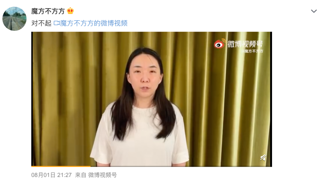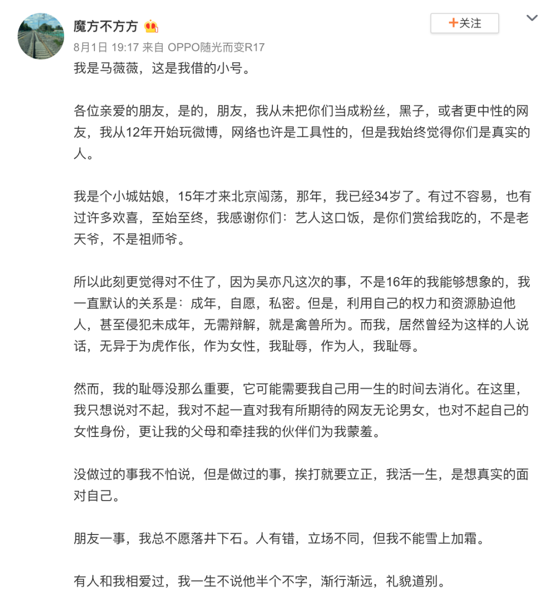 8月1日,马薇薇用小号发长文道歉,随后还录制了视频,她表示,“我为我过去的不当言论表示真诚的歉意,对不起...我不知道做什么打算,我只是想不再恶心大家了。”宣布自己将离开娱乐圈一段时间。
