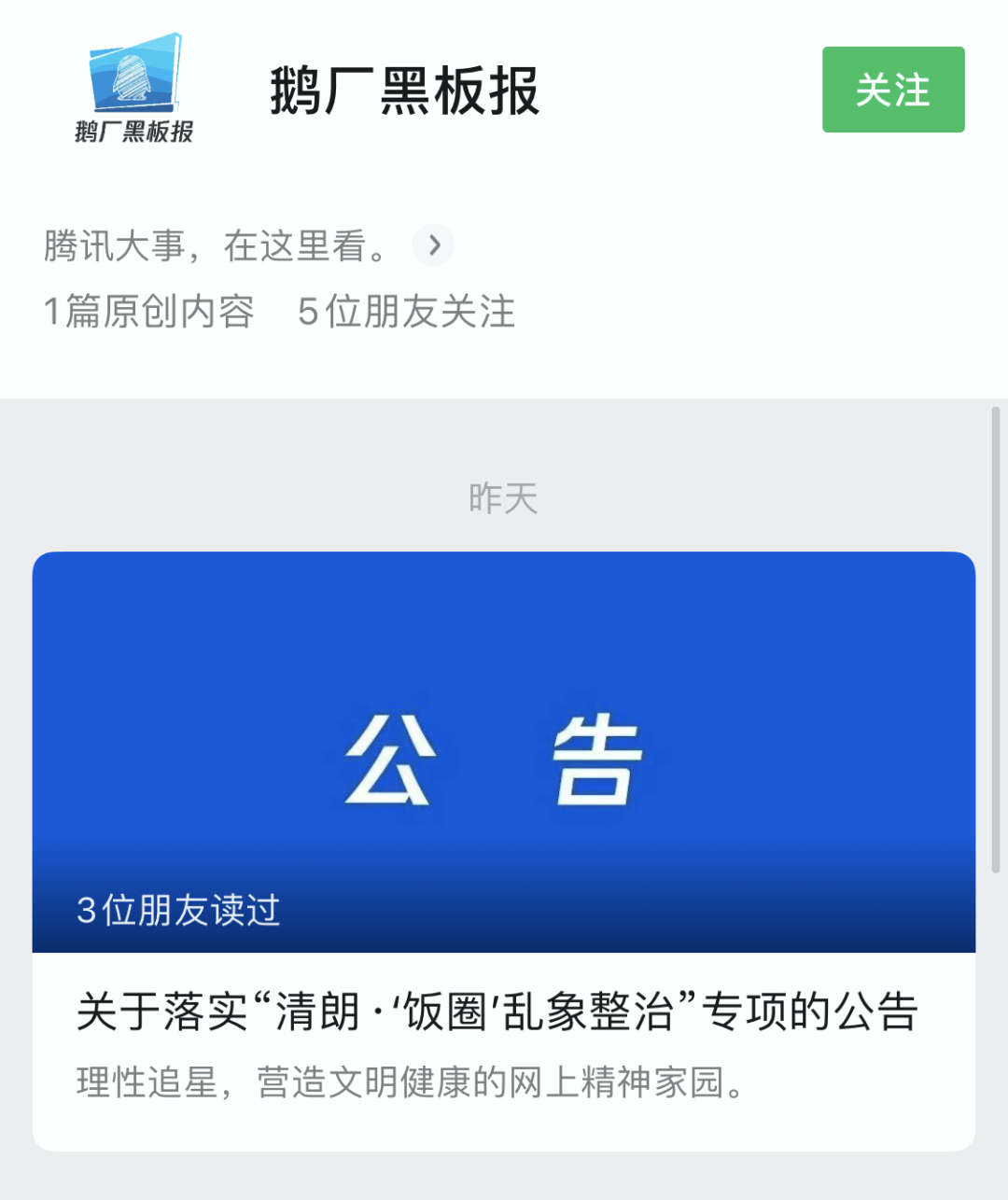 8月1日晚,对吴亦凡事件造成的影响腾讯方面也有所回应,据鹅厂黑板报微信公众号发布《关于落实“清朗·‘饭圈’乱象整治“专项的公告》。