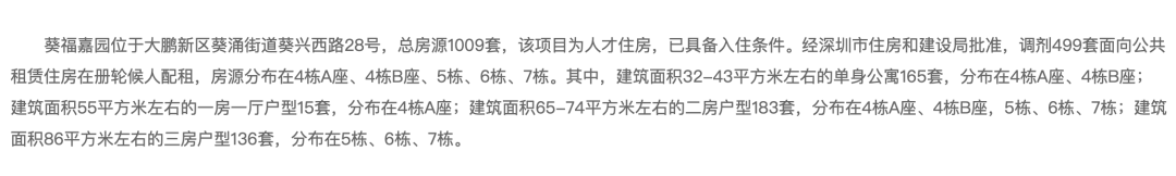 公租房房源位于大鹏新区,面向公共租赁住房在册轮候人,公开配租499套葵福嘉园公共租赁住房,基准租金标准暂为14.39元/月•平方米。网上认租时间为2021年7月30日09:00至2021年8月18日18:00。