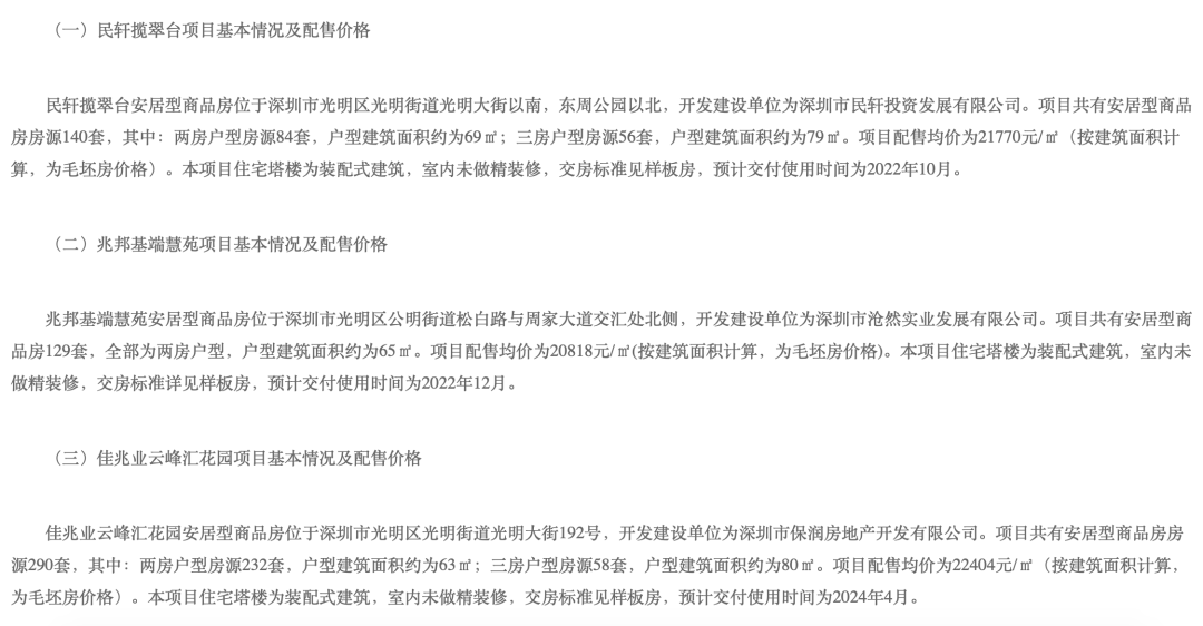 安居房位于光明区,这次配售的有三个项目,均价20818-22404元/㎡,单身居民可申请两房两厅。网上认购时间为2021年7月30日09:00至2021年8月6日18:00。房源具体信息如下: