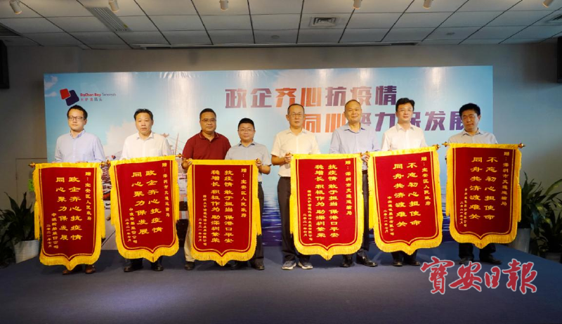 政企齐心抗疫情,同心聚力保发展。面对外贸出口“一舱难求”的局面,7月30日,在深圳市交通运输局、宝安区人民政府的支持引导下,宝安大铲湾码头组织协调加班船——“弘发上海轮”开通直航欧洲航线,为粤港澳大湾区外贸出口企业雪中送炭,有效缓解了部分紧急舱位需求。当天下午,小米科技有限责任公司、中兴通讯股份有限公司作为企业代表在大铲湾码头现场向宝安区政府等单位赠送锦旗以示谢意。