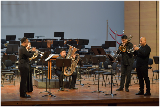 当晚,由青年演奏家于飞、戴宸、韩栩、温佳兴、邢柏豪带来的木管五重奏,因形式新颖、风格独特,将现场气氛推至高潮。他们同为宝安区青少年管弦乐协会会员,为观众演奏了《千与千寻》《阿里山的姑娘》《卡门组曲》等经典名曲。铜管五重奏的五位演奏家同样来自宝安区青少年管弦乐协会,他们分别是白飞龙、马俊、毛冉、张宝坤、陈天浩,演奏了《Jingo Bell Rock》《天堂电影院》《柯南》等知名曲目,行云流水般的演绎获得了在场观众的阵阵掌声。