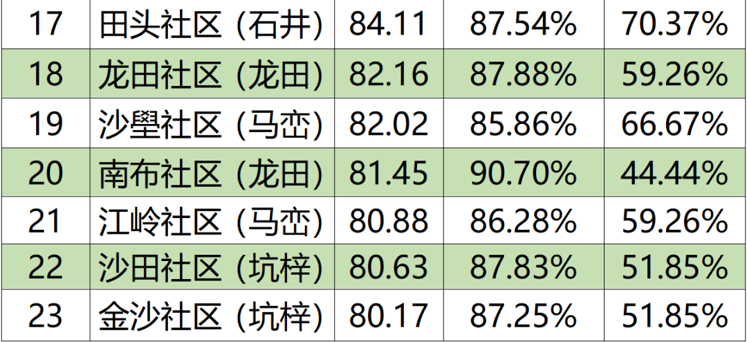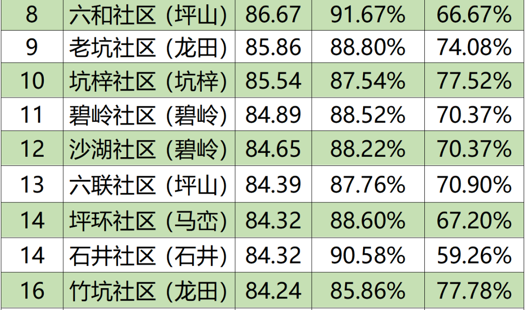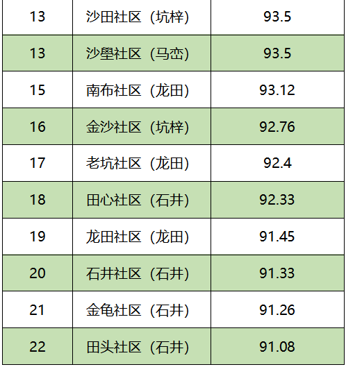 相比上一期,本期社区市容环境指数提升明显,坪山区各社区得分及排名。