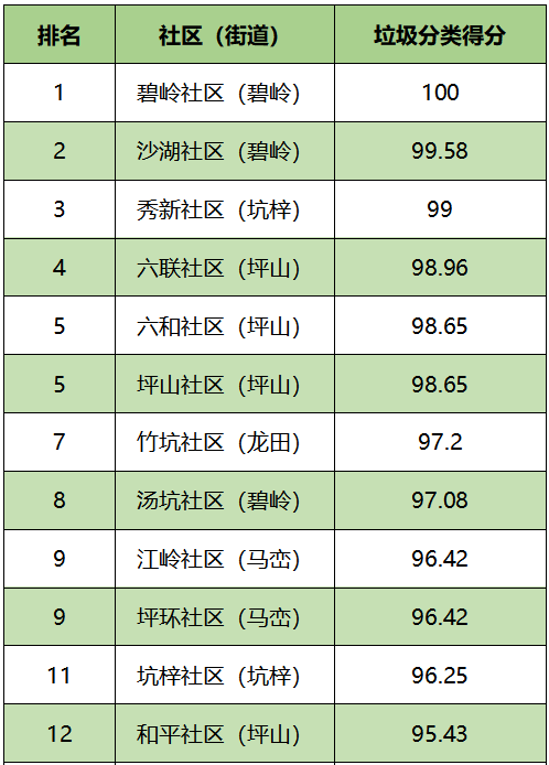 测评结果显示,坪山区垃圾分类指数测评得分为95.29分,较上期提升了4.68分。在各街道排名中,碧岭街道凭借垃圾分类点夜间督导及良好的日常管理情况脱颖而出。而排名相对靠后的街道,之后要继续加油哟!