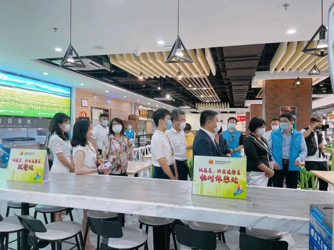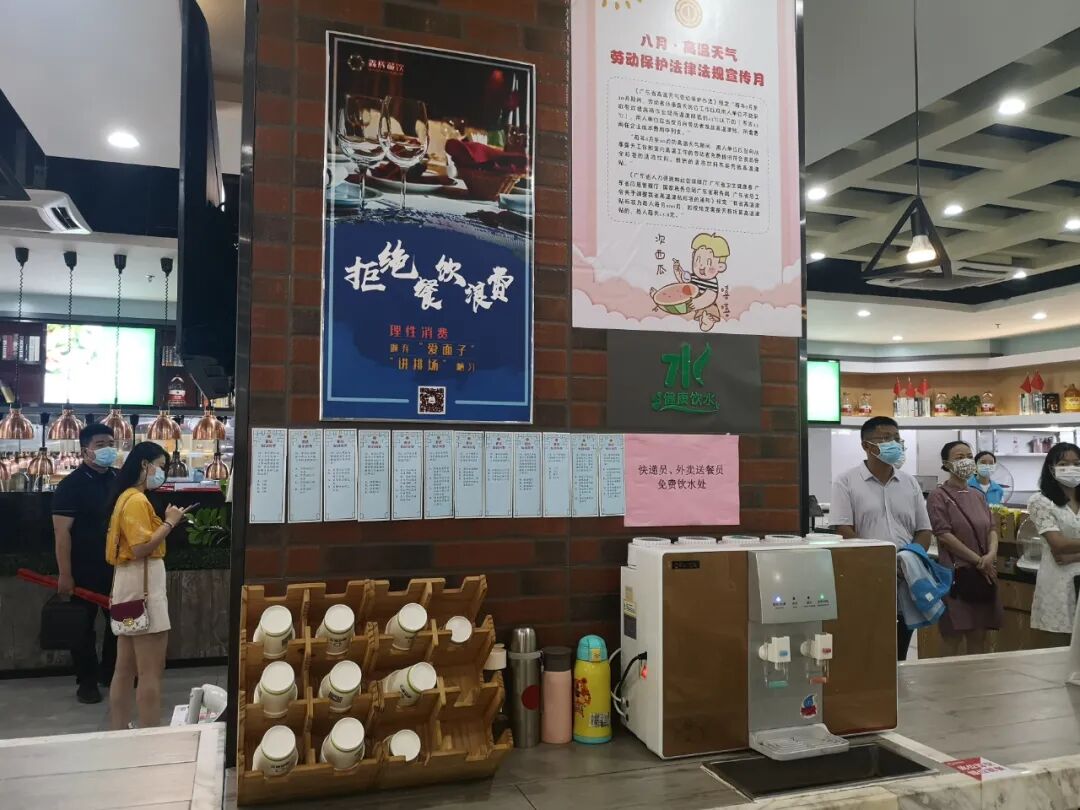 据介绍,南山工会深圳湾大食堂为快递员、外卖送餐员设置了免费饮水处,并且在饮水处张贴了《劳动保护法》;在饮水处还设有答题有奖环节,职工可以在休息期间参与活动,达到学法的目的。
