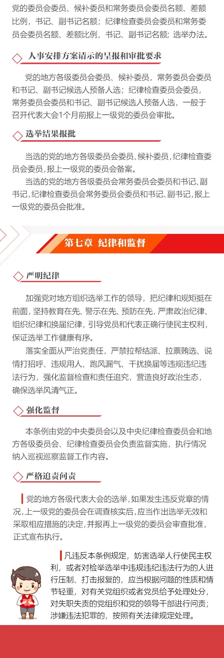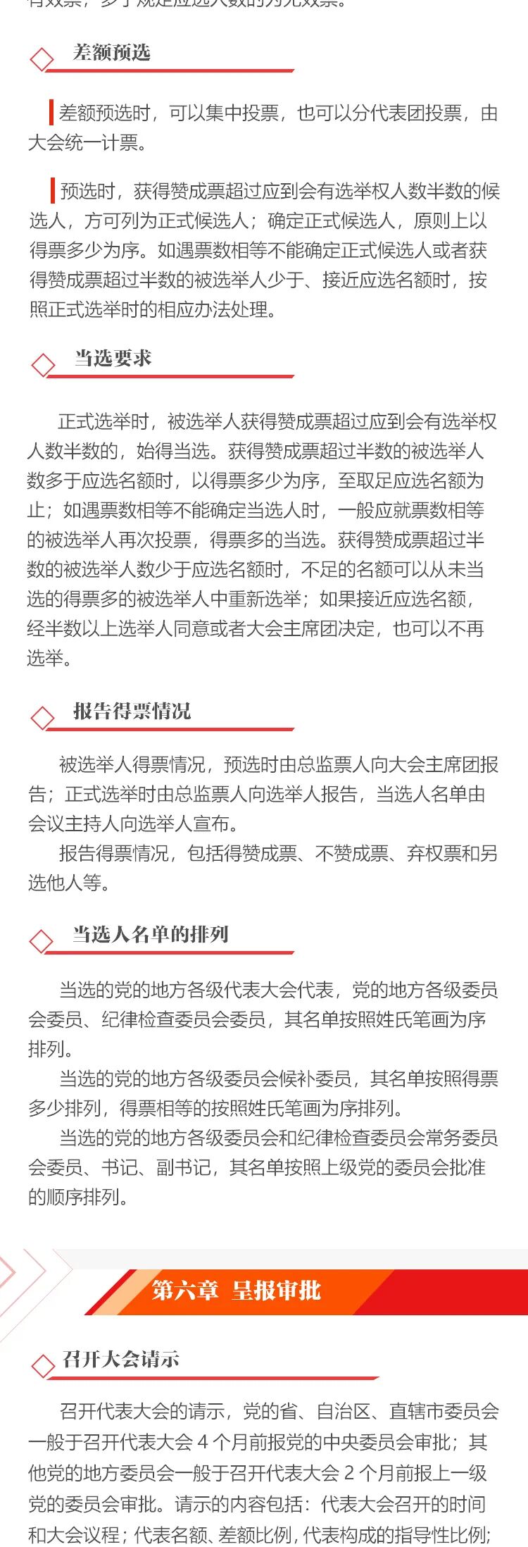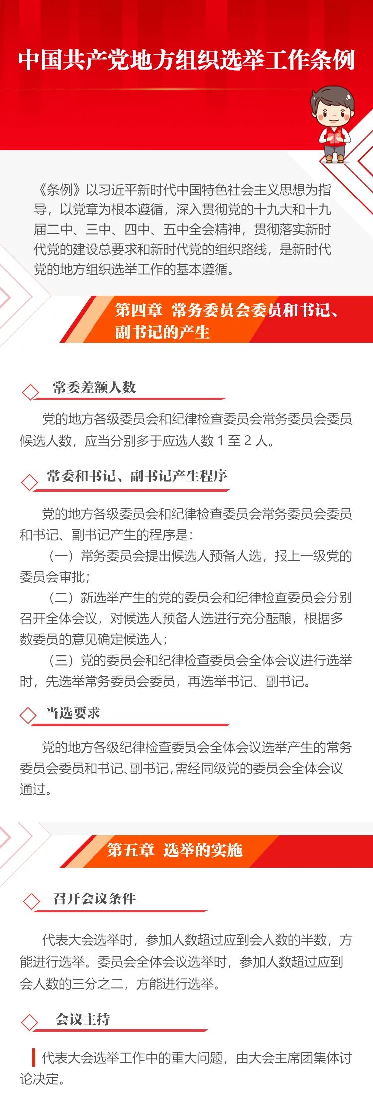 为推动各级党组织和广大党员干部认真学习《中国共产党地方组织选举工作条例》(以下简称《条例》),增强贯彻落实《条例》的思想自觉、政治自觉、行动自觉,做好换届选举工作,现推出系列图解,对《条例》进行逐章解读