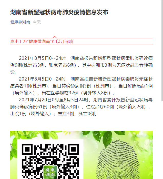 2021年8月5日0--24时,湖南省报告新增新型冠状病毒肺炎确诊病例9例(株洲市3例,张家界市6例) ,其中株洲市3例为无症状感染者转确诊。